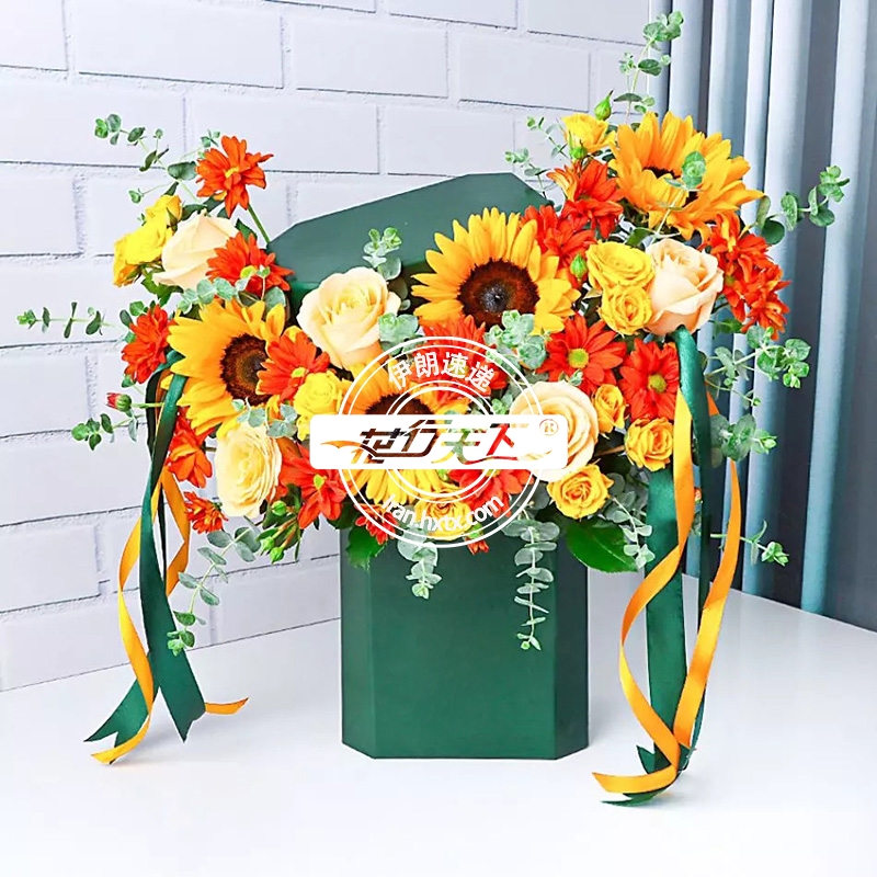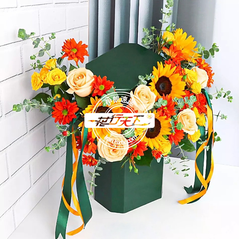 玫瑰、向日葵、非洲菊和迷你玫瑰组成、精美包装.
